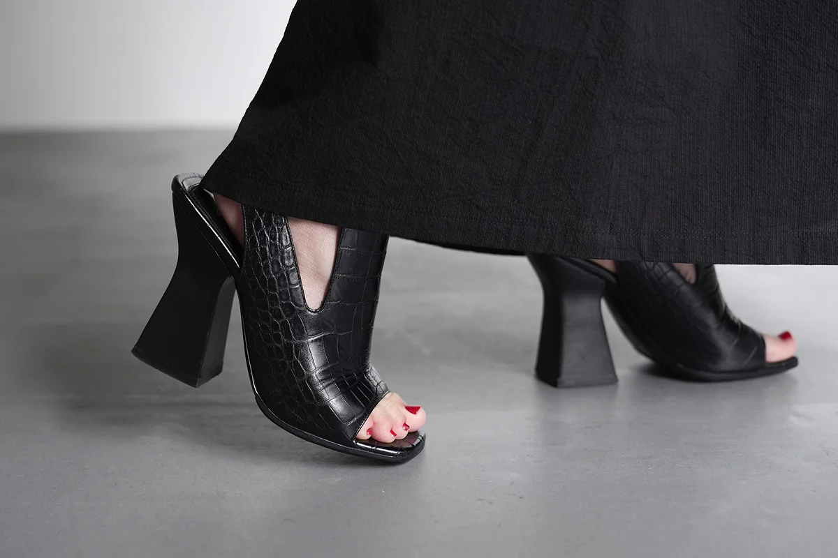 ヒールは高めのものを。 私は身長が低いので、 ヒールを履いてバランスを取ることが多いのですが、 それだけじゃなく、ヒールを履くと 自然と背筋がシャンとして、 なんとなく非日常気分を味わえるというか、 ファッションの醍醐味でもある高揚感があるんです。 もちろん歩きやすい靴を選ぶこともありますが、 ワイドパンツやこういった分量感のあるワンピースには、 やっぱりヒールを合わせたくなる。 カジュアルなだけじゃなくて、 ほんのり女性らしさも加えたくなるんですよね。