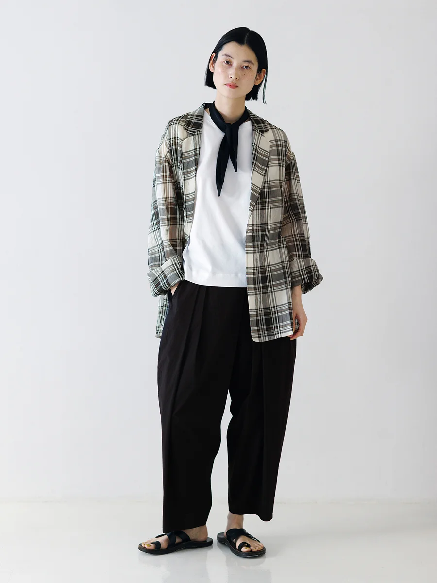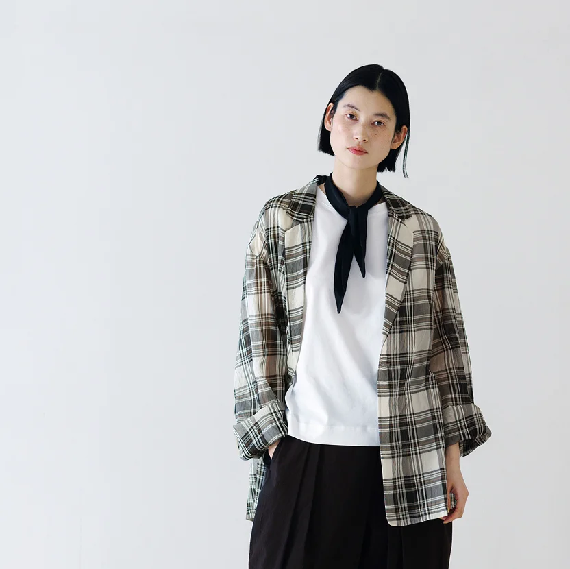 シンプルでありながらも、凛としたモダンさが漂い、 身に纏っているだけで上品にうつる。 ことしの春夏も、そんな洋服とともに過ごしたくて、 昨年につづき オリジナルアイテムをふたつセレクトさせてもらいました。 羽のように軽いチェック柄のサマージャケットと、 ビジネスシーンでも使えるアシンメトリーワンピース。 浅川さんご本人にうかがった デザインの工夫や素材のお話とともに、ご紹介します。