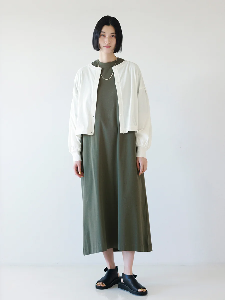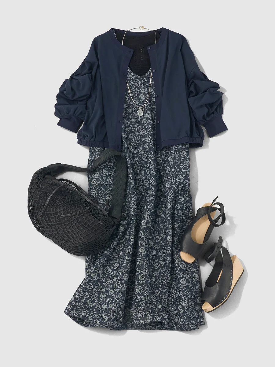 宇和川 サマーパフカーディガンは着丈がコンパクト。 ワンピースのような 長さのあるアイテムと合わせても重たくならず、 引き締め役になってくれます。 このミッドナイトカラーでは、 落ち着いた雰囲気を活かして、 よそ行きのスタイルをつくってみました。 同系色の柄のワンピースを合わせて統一感を出しつつ、 シルバーで透明感のあるアクセサリーを添えて、 春夏らしい涼やかさをプラス。 レストランでのお食事や観劇、コンサートなど、 少し特別な日に着たくなるコーディネートです。