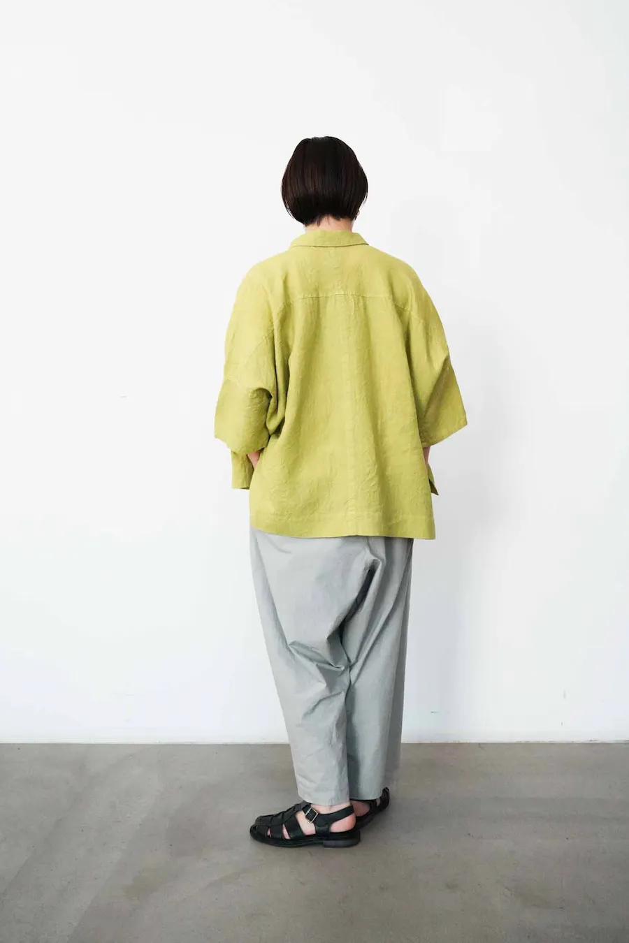 セージのような中間色は、 色数を3つに絞るとまとまりが出ます。 シャツを少し開けて、インナーに白をのぞかせることで、 全体のバランスがぐっと整います。 トップスは明るめの色を選ぶと、春夏らしい軽やかさに。 足元は黒で引き締めても、白で抜けをつくっても。