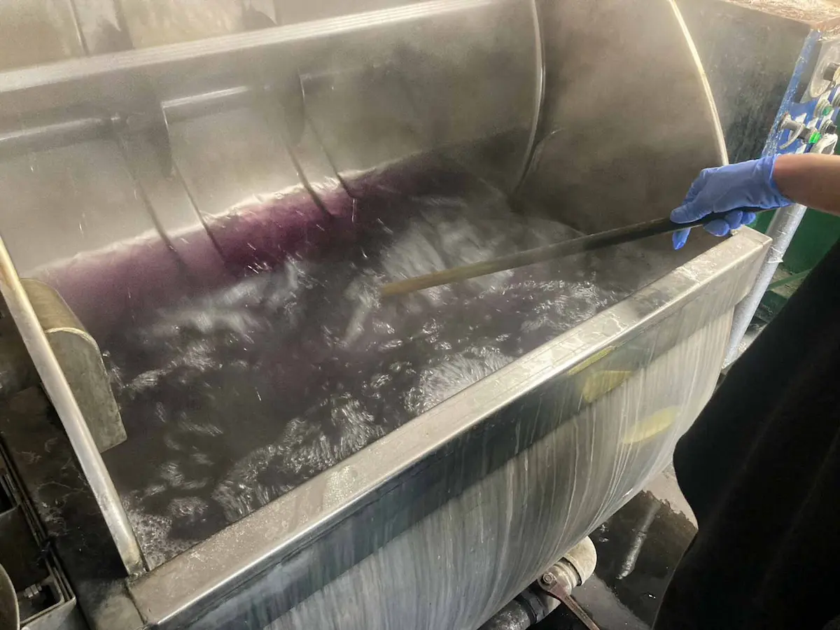 塁 染め場にご案内しますね。 ドラム式の機械もありますが、 今回のボトムスはパドル染色機を使っています。 薄い生地なので、デニムのように叩くのではなく、 水の中で“泳がせる”ように染めていきます。