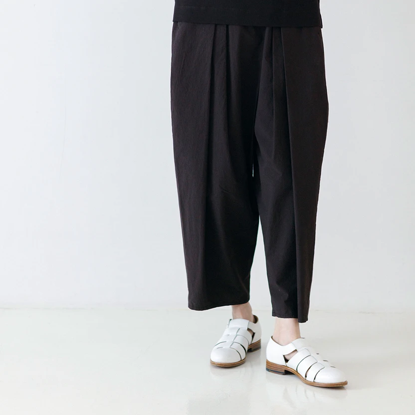 形は、「FACTORY」のロングセラー、 ハカマバルーンパンツ。 さらりとしてベタつかず、シワになりにくい 近江晒加工のコットン地を使い、 自社工場で丁寧に製品染めを施しています。