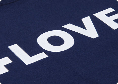 プリント部分は 顔料とラバーを半分ずつまぜた“ハーフラバー”に プレスをかける、という手法を採用しました。 通常のラバープリントより厚ぼったくなく、 それでいて輪郭がくっきりと出るのが特長です。 この手法を採用することで、“+LOVE”のロゴを シャープにプリントすることができました。