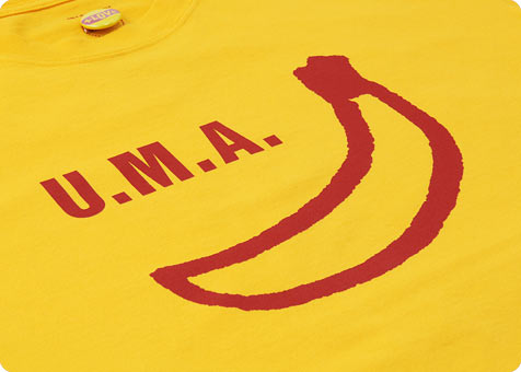 こちらのTシャツでも、 バナナのイラストと"U.M.A."のロゴは ハーフラバーでプリントしました。 えんじのような「大人レッド」が やや赤みがかった黄色にぴったりマッチ。 元気だけど、あざやかすぎない色なので、 大人のかたにも、ぜひぜひ着てほしい!