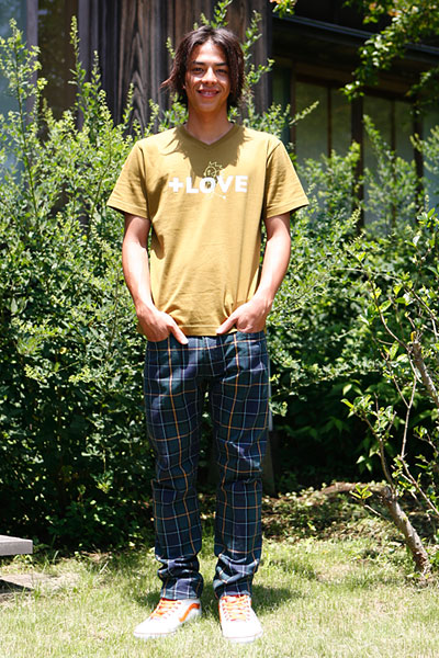 これ、男の子には、ドンピシャでしょう。 今回、モデルで登場してくれたKENDIくんも 「僕なら、これかなー」って言ってましたけど、 ライオンさんが、強そうにしているのに、 めそめそ泣いてるところなんて 若い男性にはとくに、好まれそうですよね。 女の子でしたら、 ブラウン系のショートパンツなんかを合わせると、 これからの夏には、いいかもしれません。 Tシャツの色のきれいさを生かすには ブラウン系、あるいはベージュ系などの グラデーションで着こなすと、うまくいきそうです。 今回のラインナップの中では いちばん「ナチュラルさ」を感じたカラーなので、 自然素材のものを合わせたいですね。 生成りっぽいスカートや、 ベージュ系の麻のパンツなどに合わせれば リラックスしたスタイルを楽しめそうです。 (スタイリスト・古賀雅依子)