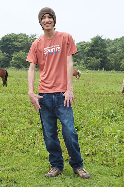 シャツのボディ色としては はじめて見た、と言ってもいいかも。 どこにもないブラウンだと思います。 この色のシャツをコットンでつくってしまうと 着こなすのに、すごく難しいでしょう。 でも、ドライ素材の光沢感で、 さっぱりカジュアルに着れてしまうから不思議です。 コーディネイトでは 全体的にカジュアルにまとめましたが シックなレザーシューズや革のブレスレットなど 茶系の小物なんかをあわせたら 大人っぽい雰囲気にもなりそうです。 スタイリストとして、 いろんな着こなしを提案してみたい おもしろさを持った色だと思います。 (スタイリスト・古賀雅依子)