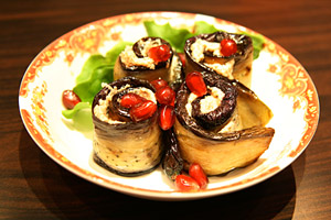 薄く切ったナスで巻いたバクラジャンという前菜。
