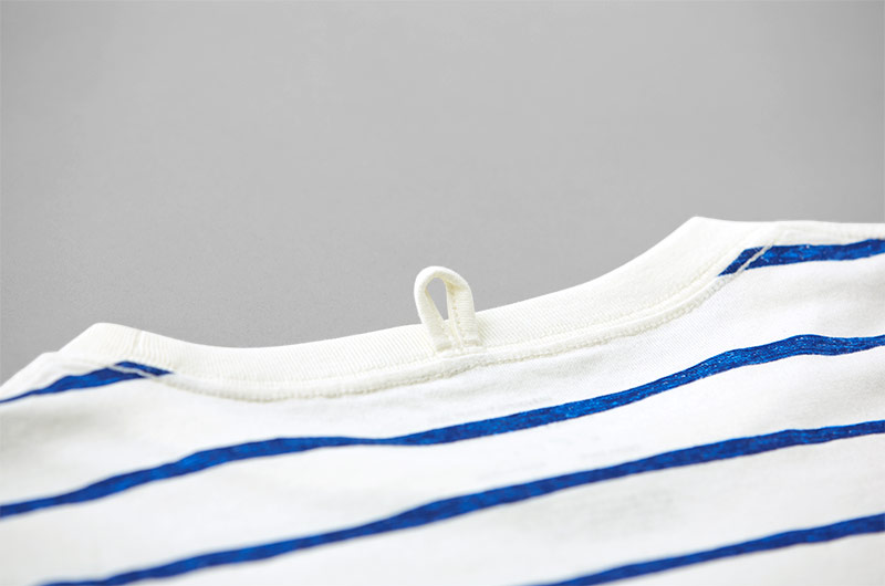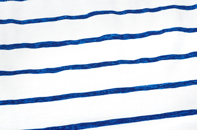 一見、ふつうのボーダーTシャツに見えますが、 近づいてみると、実はこのボーダー、 一本一本、すべて手描きされたものを、 プリントで再現しています。 フリーハンドで描かれたボーダーは、 ほかでもときどき見かけますが、 この「手描きボーダー」は、細いペンで細かく、 律儀に描き込まれているのが特長です。 そのため、遠めで見たときと、近づいたときで 印象がちがう、おもしろさがあります。 オフホワイトの生地に紺色のボーダーという、 王道の配色もうれしい、着やすいデザインです。