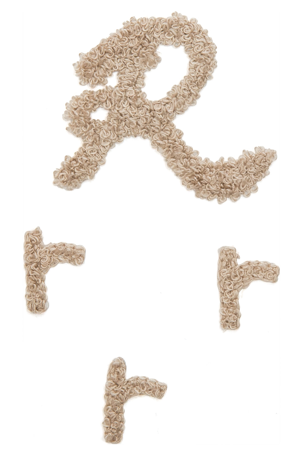 「R」は、もこもこしたワッペンです。 「L」と「R」は、どっちもこの、もこもこタイプ。 だから「LR(左右)」は、もこもこセット。 クツシタとかミトンの左右に、いかがですか? もちろん、リカさんやリョウコさんも、どうぞ。