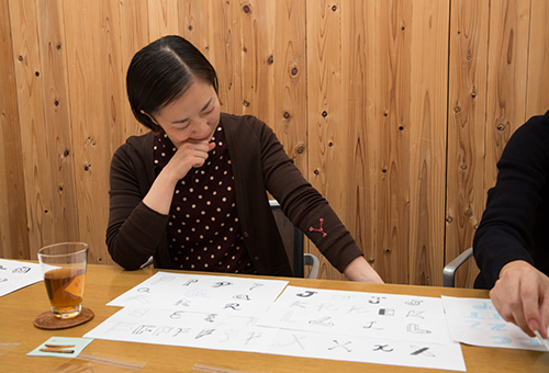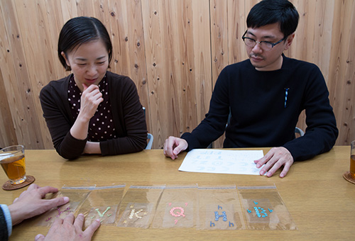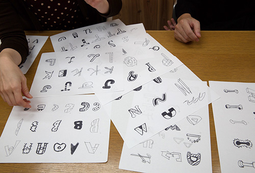 | 大原 | もう、アルファベットとも思い込まずに、 ひとつの図形として、 遊んでもらえたら良いですね。 パーツの組み合わせによっては、 顔や風景のようにもできますし。 |