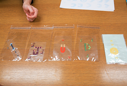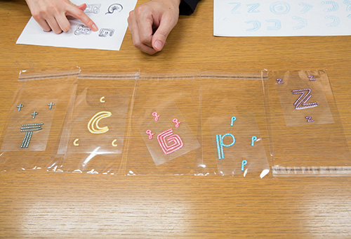 | ─── | この中から、Yさんが選んで、 針と糸でアルファベットを編んだり縫ったりしていった。 |