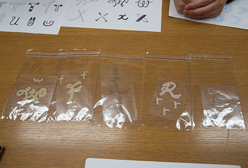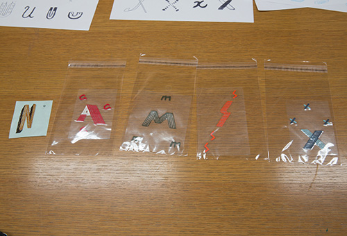 | 大原 | 5つの系統というか、 5種類の技法で取り組んでいる文字が、 アルファベットに分散しています。 まずは‥‥(ワッペンを並べる)‥‥ この6つのアルファベット。 |