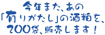 ■数量について。 「有りがたし」は新潟にある小さな酒蔵のお酒です。 たくさん作られているものではありません。 そのため、できあがる酒粕の量にも限りがあります。 そのなかから、わがままを言って200袋を、 「ほぼ日」に分けていただきました。 (この酒粕は吉川区の「よしかわ杜氏の郷」の店舗でも 販売される予定です。) 今回も、抽選となることが予想されますので どうぞご理解くださいますようお願いいたします。 (1人、1袋のみのお申し込みとさせていただきます) ■送料と値段について。 酒粕の値段は、500グラム入り1袋で、250円(税込)。 代引き手数料と送料は、全国一律で、810円。 つまり、合計すると、1060円かかるという計算です。 送料が商品代金の3倍以上!! となります。 前回販売したときにも、 もうしわけないと思いながら、 「通信販売の宿命と思し召しくださいな」 ということをお願いしましたが、 やはり今回もそのお願いを みなさんにしなければなりません。 どうぞよろしくお願いいたします。 おっしゃ、250円の酒粕、 810円の送料払ってでも食べたい! と思われる方、ぜひぜひお申し込みください。