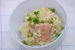 1 ボウルに酒粕をこまかくちぎって入れる。 2 牛乳は電子レンジで温め、 少量ずつ1に入れて酒粕をのばす。 そんなに簡単には溶けないので、 のんびりとどうぞ。 3 なめらかに溶けたら、 もう一度レンジでチンしてあたため直す。 ※甘めがお好みでしたら、 砂糖を入れて味を調節してください。 絞ったショウガの汁を加えるのもオススメです。 ■鮭とじゃがいもの粕煮 ![]() 用意するもの(2人分)