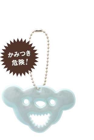《ご注意》 このデザインは、くまの歯がとがっていますので、 お子さまが指をかまれてケガをしないよう、 じゅうぶんご注意ください。 交通安全グッズなのに危険って!? たしかにその通りですが、 世の中とは、えてしてそういうもの。 それでもお気に召したら、ご用命ください。