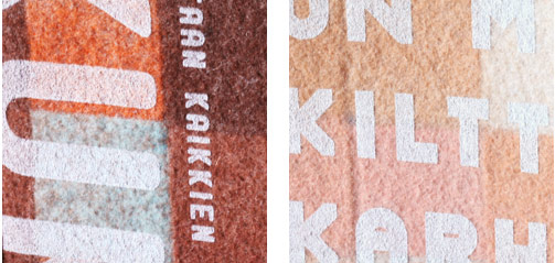 なお、フェルトのもつ「手づくり感」に合うよう、 プリントのインクもべったりとは載せず、 あえて、下地のもようが透けるくらいの濃さに とどめています。 |