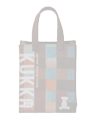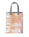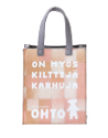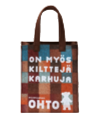 ブラウンの地をベースに、 えんじ、オレンジ、グレー、ベージュ、ターコイズなど、 8色がモザイク状に組み合わせられたフェルトに、 KUKKAのロゴとシルエットをあしあらいました。 モザイク柄がよく映えるデザインです。