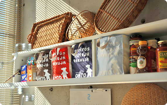 「見せる収納」にも、「こぐまの紙ぶくろ」は使えます。 台所だったら、野菜など食材のストックや、 スーパーの袋など、なんとなく置き場所に困るものを、 こんなふうに種類別に入れて並べておくと、 かわいいですよね。 料理がいっそうたのしくなりそうです。