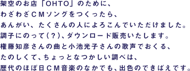| 「センチメンタルテリトリーの冬じたく」や、 「AcousticT」の予告音楽で、 「ほぼ日」でもすっかりおなじみになった権藤さんは、 CM音楽やYMO、チャラのサポートなど、 第一線で活躍されている音楽家です。 不思議キャラでも仕事は一流、 今回もすばらしい歌をつくってくれました。 |