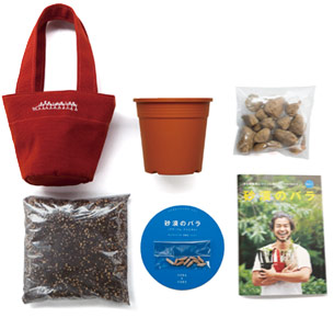 | 砂漠のバラの種(10個入り) ヤシガラ+日向土(専用にブレンドした用土) 底石(日向土の粗目石) プラ鉢(3.5号:直径10.5cm) うさみみバッグ(帆布製) ブックレット(フルカラー32ページ) |