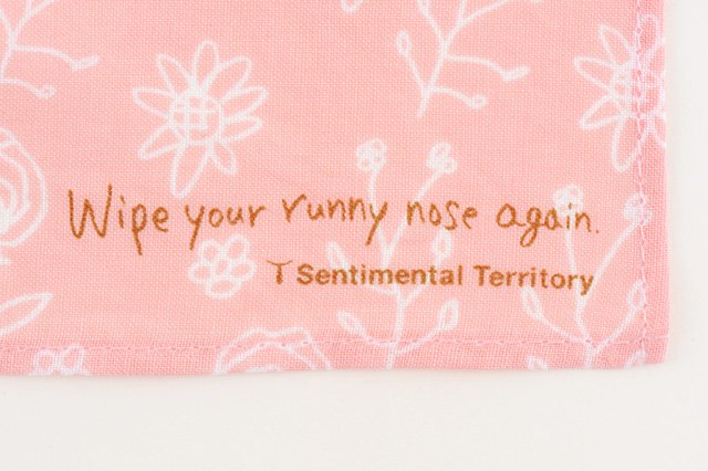 ん? ふつうのピンクの花柄かな? そう思ったら、大まつがい。 花と花の間には、センチメンタルテリトリーの たくさんの住人たちが、涙を流しながらたたずんでいます。 ちょっと乙女チックに使える一枚、かな?