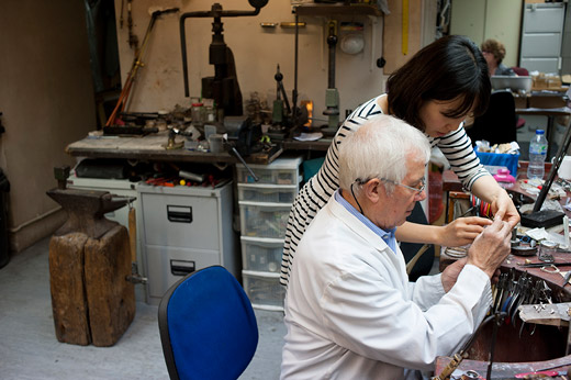 | イセキ | あとは、そう、 工房の20〜〜30代のアシスタントの女の子たちが、 私が置いていったブローチを見て、 「キャーッ、やりたい、やりたい」と 盛り上がってくれたと聞きました。(笑) それでライオネルさんも、 「うちのガールズが楽しんでるから、いいよ」 と。 |