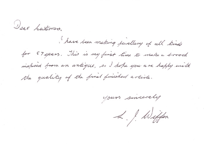 | 「小鳥のブローチ」をお買い上げのお客様へ 57年間、私は職人として あらゆる種類のジュエリーを作ってまいりましたが、 アンティークの品からインスピレーションを得た ブローチの製作は、これが初めての試みでした。 完成品の仕上がりに ご満足いただけることを願っております。 敬具 ライオネル・J・ウィッフィン |
