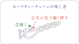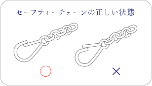綿100%の布地に変色防止剤と ■その他 「つばめのブローチ」の使用方法について ブローチの裏のピンは、 <ブローチ本体の針の開け閉めの仕方> <セーフティーチェーンの正しい状態と、付け外し方>
