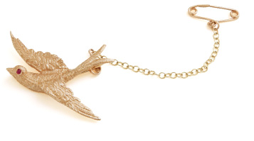 〈素 材〉 つばめ:天然ルビー、9カラットのピンクゴールド セーフティーチェーン:9カラットのイエローゴールド