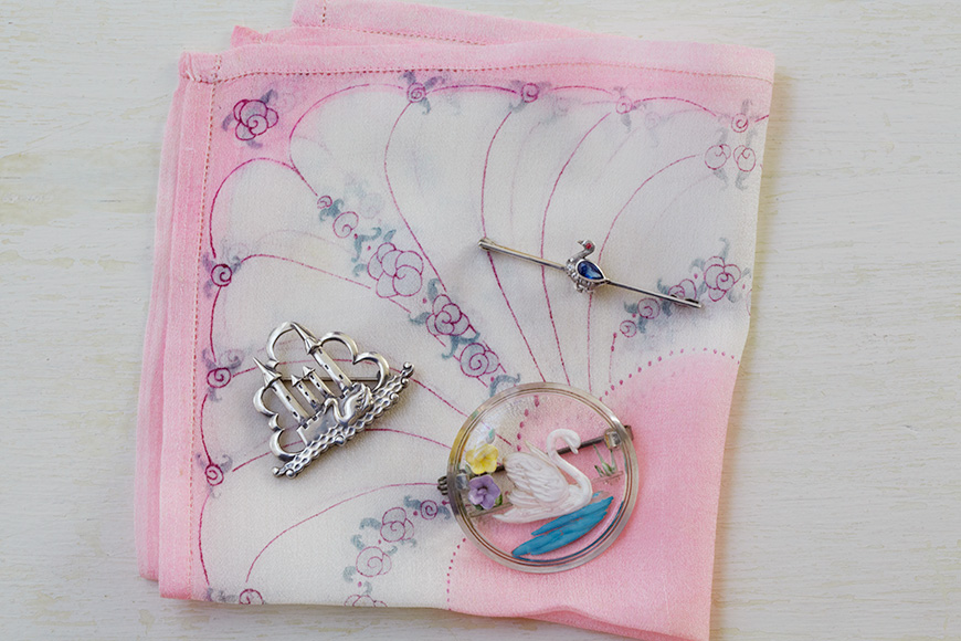 たった一羽の相手を生涯の伴侶とする白鳥は、 ジュエリー界で「変わらぬ愛」のシンボルとされています。 この100年にたくさんつくられた白鳥のブローチから、 イセキさんが惹かれるタイプを3点。 |
