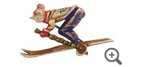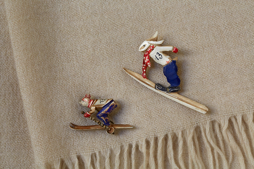 木を削って作ったような質感と軽さのベークライト。 1907年に発明された世界初の合成プラスチックで、 ジュエリー素材としても1920年ごろから欧米でブームに。 そんな素材で作られた、スキーをモチーフにした2点です。 |