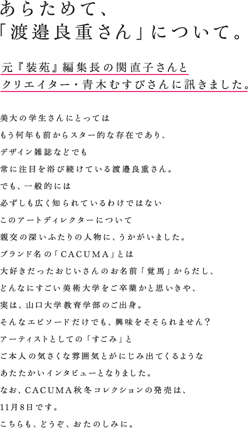| ―― | キギのオフィスのかたに聞いたんですが 良重さん、気づくと CACUMAの仕事をやっているらしく‥‥。 |