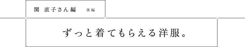 | 関 | まずは、デザイン的に着やすく、 はやりすたりが無いこと。 素材が心地いいこと、 あとはやっぱり、 自分の体型にしっかり合っていることかしら。 |