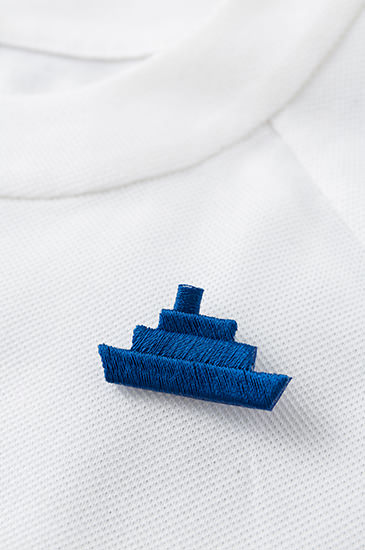 刺しゅうでできた、船のかたちのピンバッチ。