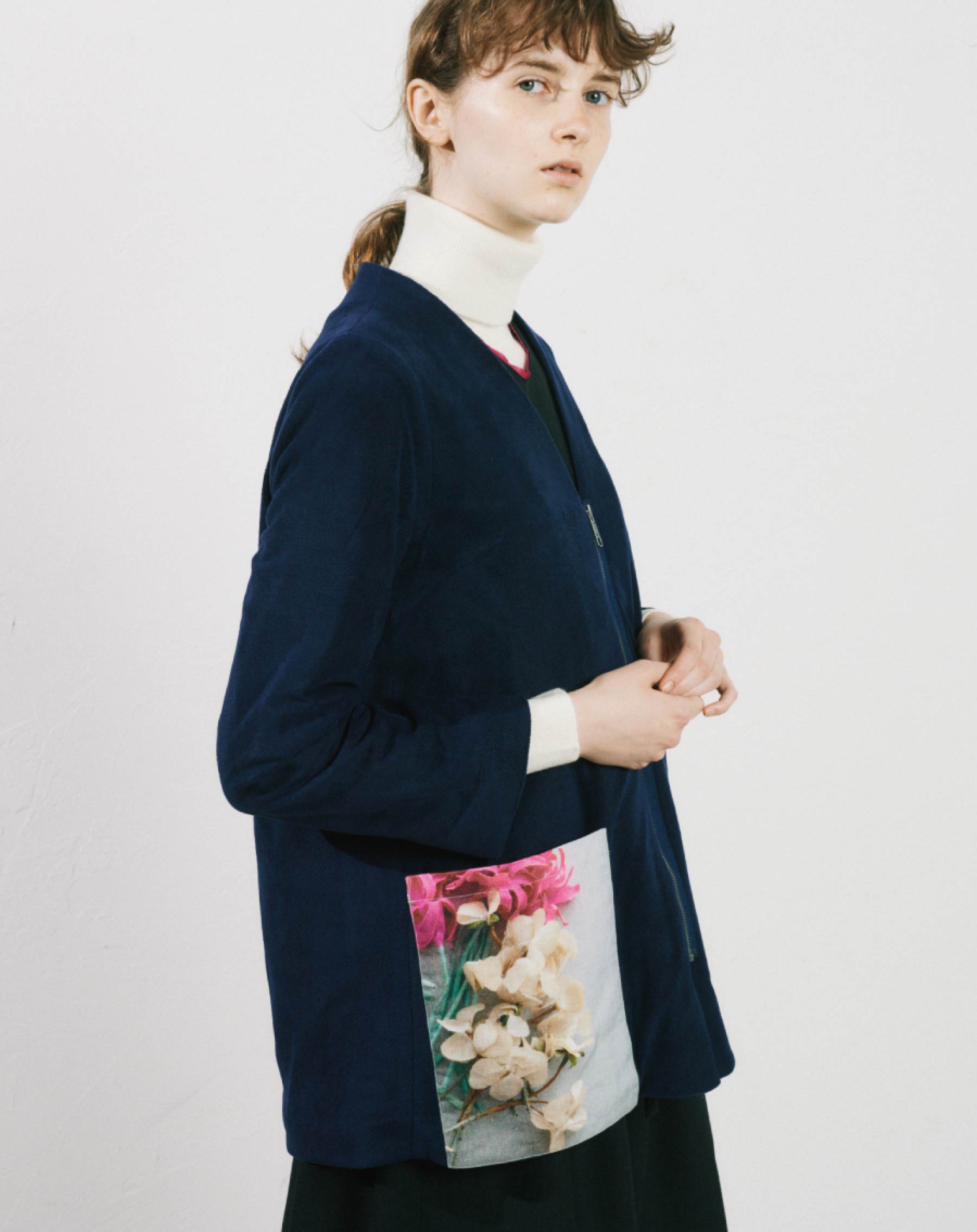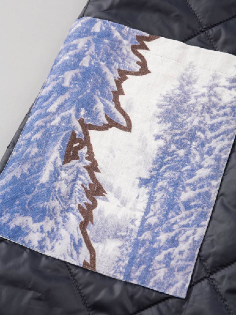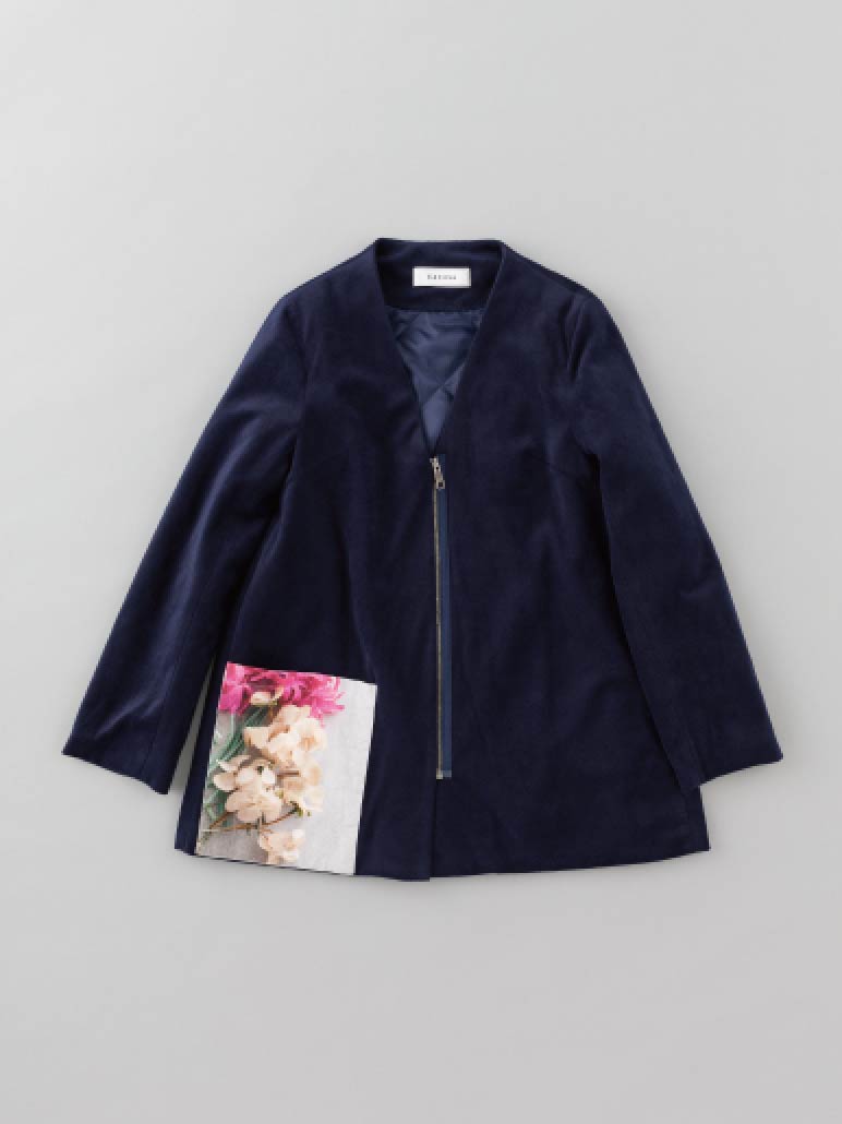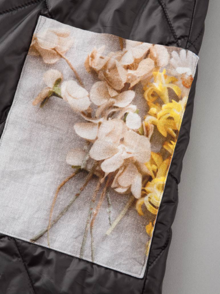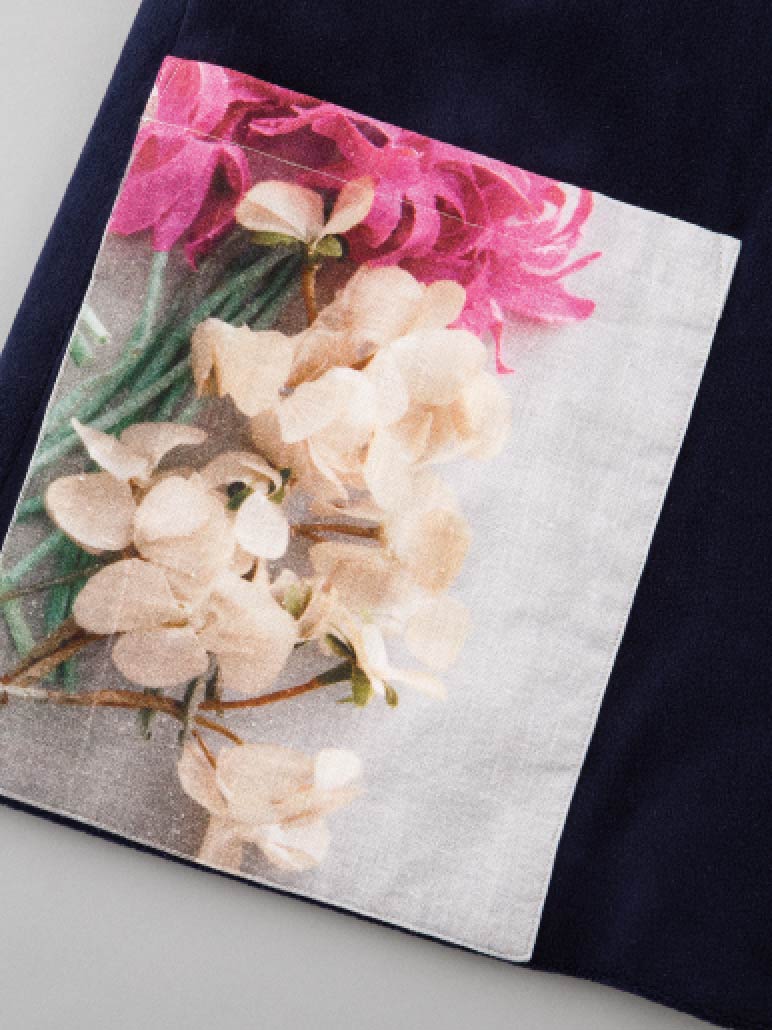 印象的なポケットは、麻素材にプリントをしています。
