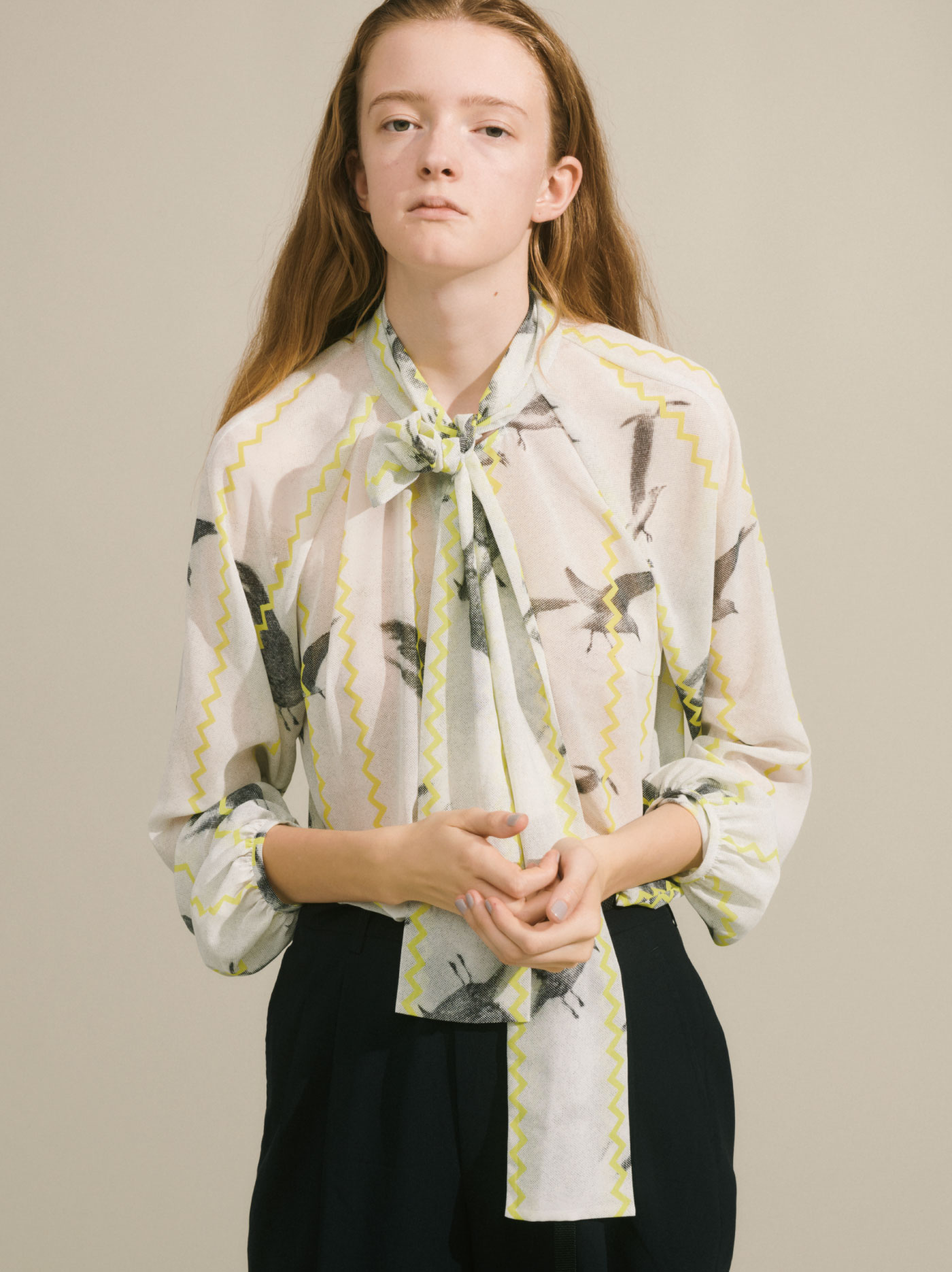 軽い着心地のボウタイブラウス。