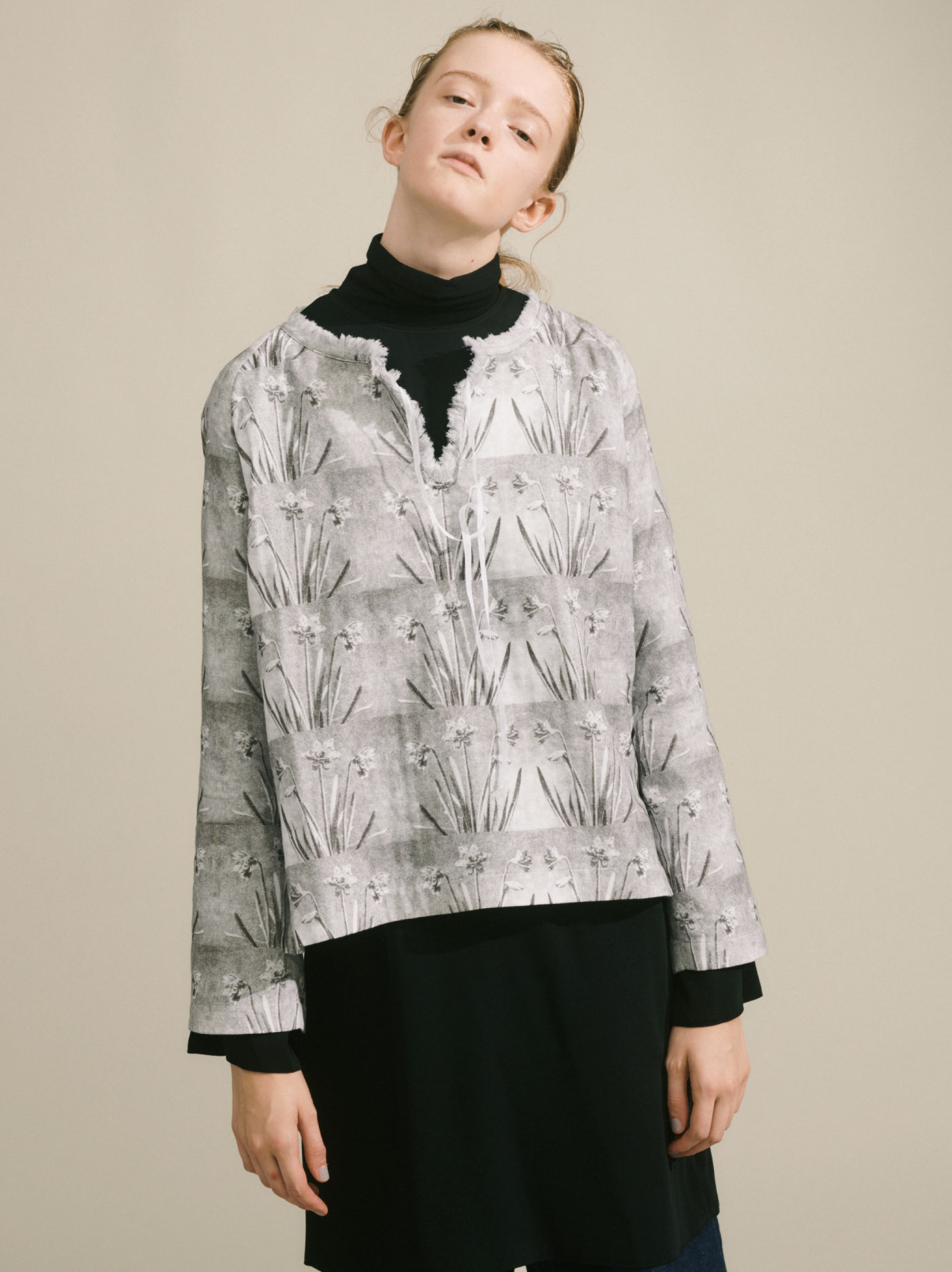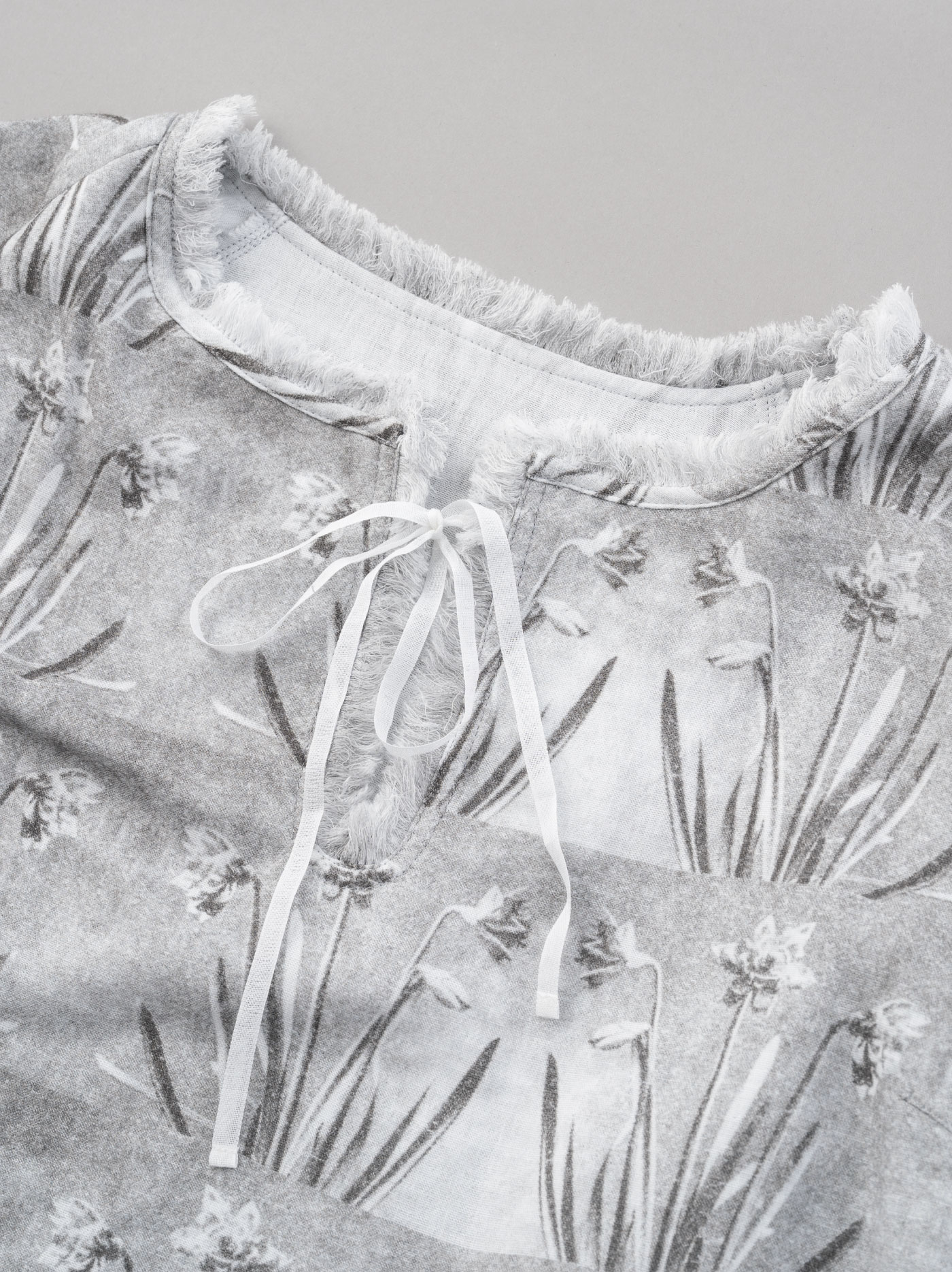 首元のフリンジがポイントのモノクロで水仙が