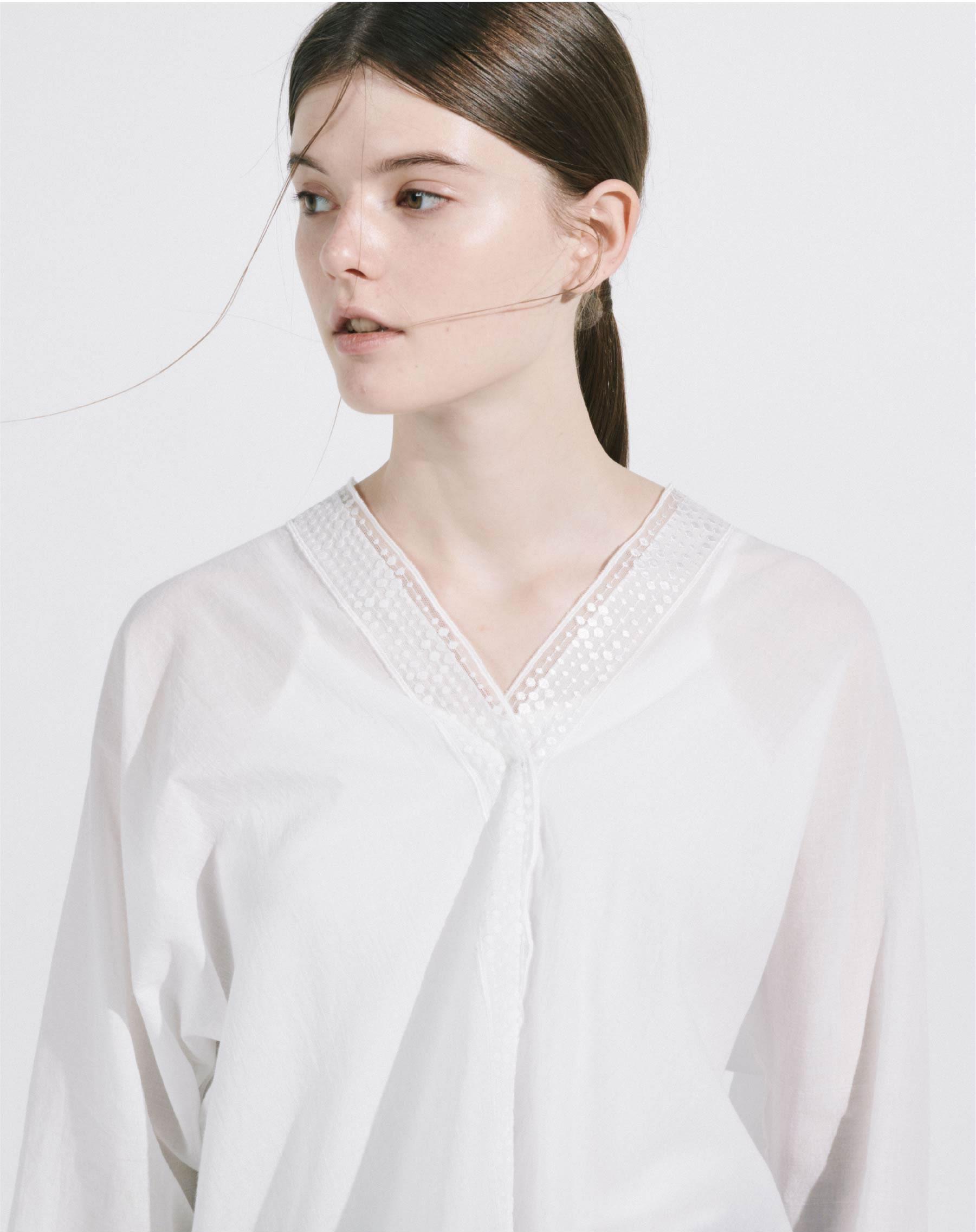 首元のほどよい開きがシャープに、すっきりとした印象です。
