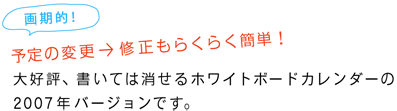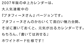 ほぼ日ストアでの販売は終了しました。 ひきつづき、全国ロフトで販売中! ※大判の「ホワイトボードカレンダー2007」は、 全国ロフトで完売しました。 「ブタフィーヌさんの卓上カレンダー」は、 ひきつづき全国ロフトで販売中です。