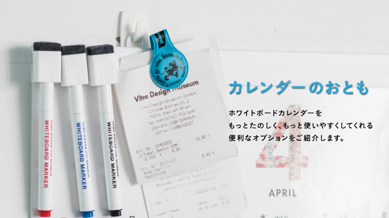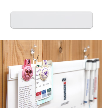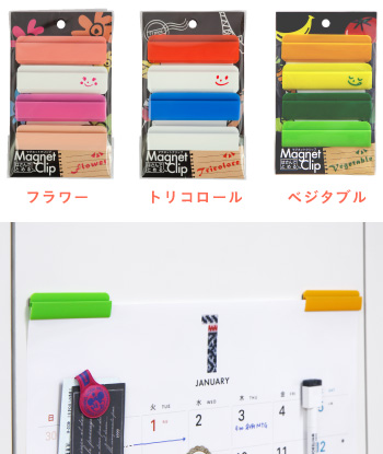付属の「ツールバー」はもちろん、 冷蔵庫のドアなどカレンダーまわりの金属面で 便利に使えるマグネットクリップです。 マグネットとクリップがひとつになっているので メモやチケットを挟むことができます。 ホワイトボードカレンダーを貼る場合は、 カレンダーを 一枚一枚切り取ってご使用いただくことを おすすめします。 冷蔵庫や磁石のくっつく壁に カレンダーを貼るときに便利です。