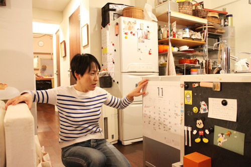 | 香さん | この「書いては消せる」ということが 予想以上に便利でしたね。 夫とふたりだけのときは、 ほぼカレンダーは使っていなかったんです。 でも、この子ができて3人になると、 「いつ、何があるか」とか 「この日とこの日は仕事」とか‥‥。 |