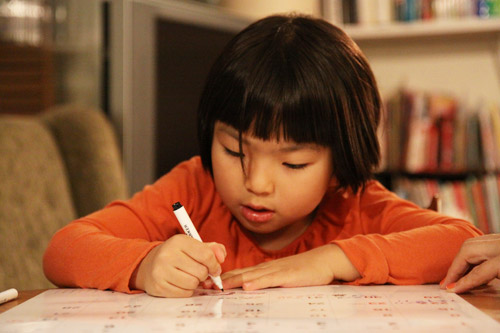 | 香さん | そうそう、いいよ。 「ます」‥‥ゆっくり大きくー‥‥「かい」。 はーい、書けました。 |