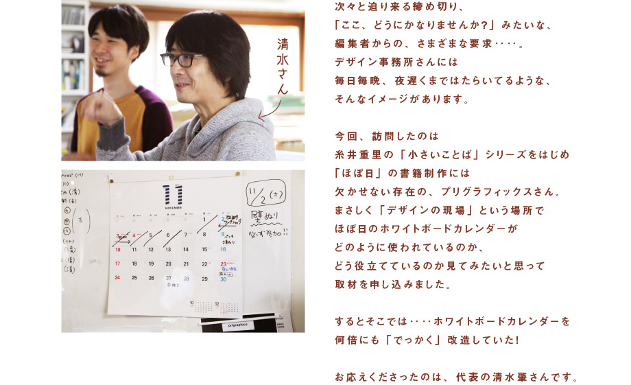 | 清水 | 書き込んだ予定を消すことができるのって、 すごく便利ですよね。 ふつうの家庭とか職場なら この大きさでも十分だと思うんですが うちは、6人くらいスタッフがいるうえに、 それぞれが、 それぞれの締切を抱えているんです。 |