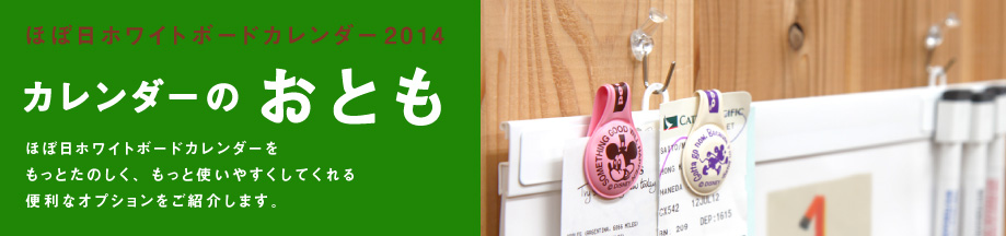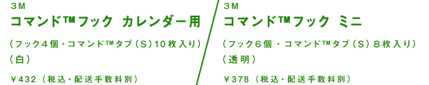 | カレンダーを壁面や冷蔵庫などに 掛けるときに便利なフックです。 粘着力が高くて、 必要がなくなったときには きれいにはがせるすぐれもの。 耐荷重はひとつにつき透明フックは200グラム、 白フックは500グラムなので ツールバーにペンや紙を貼りつけることを考えると フックをふたつ吊りにして いただくことをおすすめします。 |