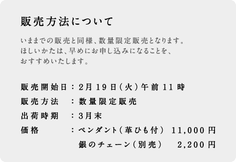 長さは約60cm、太さは約1.3ミリで、やや細め。 長さ調節のできないつくりなのですが、 こちらに付け替えると より女性らしい、繊細な雰囲気に変わります。 その日の気分やお洋服によって 付け替えてみても、楽しいですよね。 ずっとたいせつにしてほしいから、 パッケージにも、ちょっと手をかけました。 ![]() ペンダントを直接つつんでいるのは オリジナルの黒い麻ぶくろ。 表面には「なみだのロゴマーク」と 「テリトリーへ行くための方法」がプリントされています。 さらに、この麻ぶくろを 手作りの円筒状パッケージにしまいこんで、 お手もとまでお届けいたします。 |
