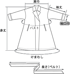 | 身丈 | 肩巾 | バスト | けまわし | 袖丈 | 袖口巾 | 長さ (ベルト) |