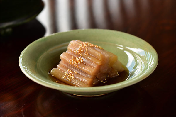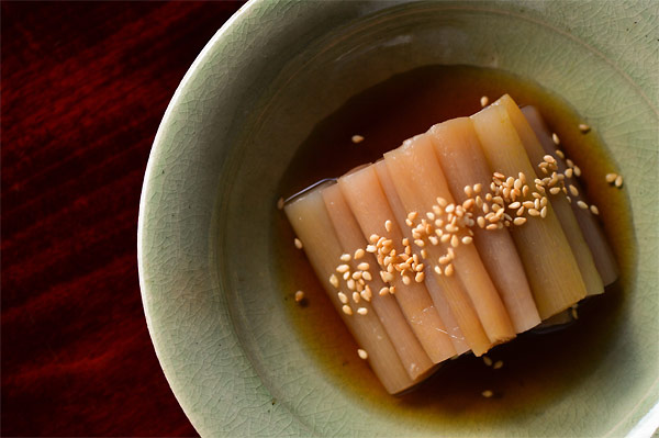八方出汁に漬けて冷やし、盛り付けたらゴマをぱらり。