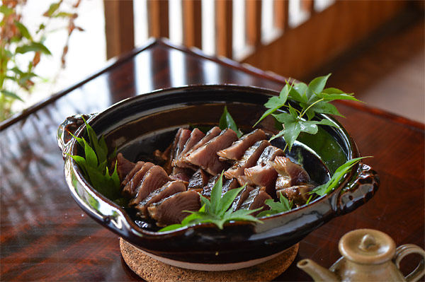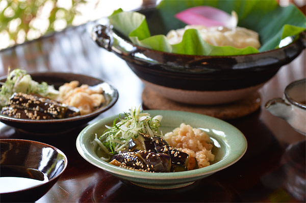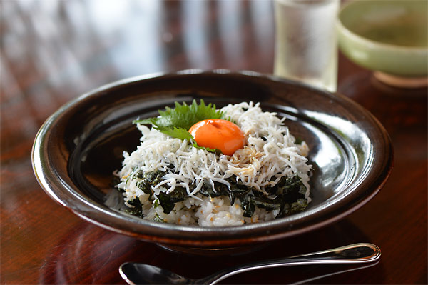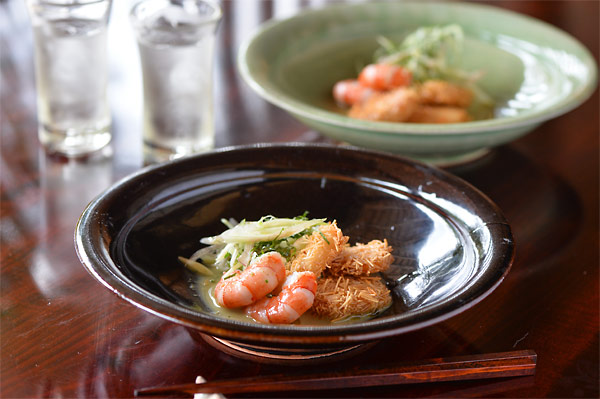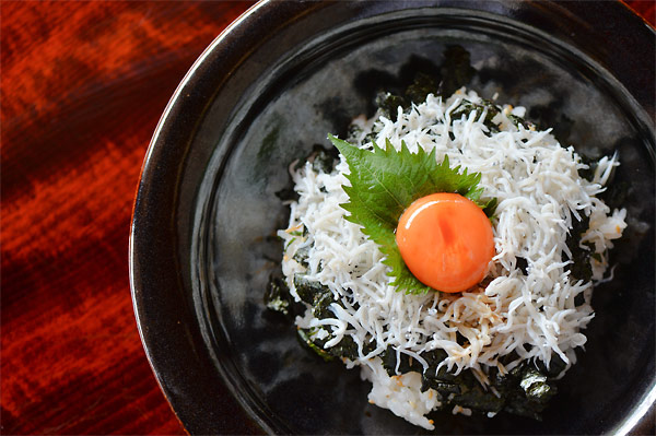 大葉をまんなかに、そして新鮮な卵黄をのせ、