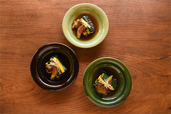 道歩さん作「夏の揚げびたし 3種盛り」。右下が青織部。