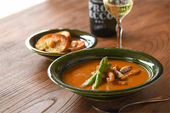 茹でたグリーンアスパラガスの強い緑がアクセントに。